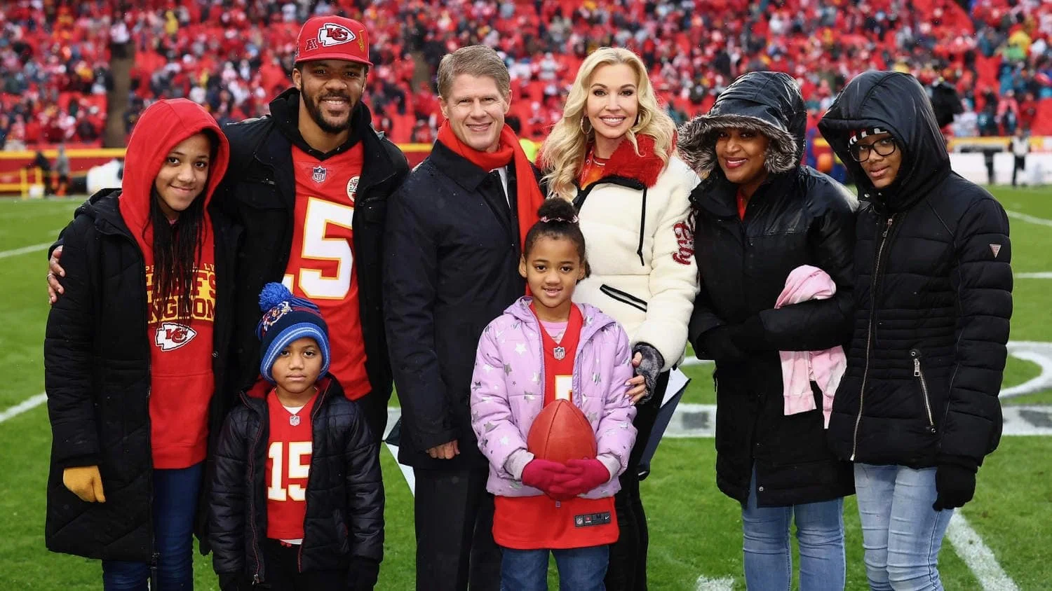 The Rhone family with daughter, Layla, center, pictured here at the Kansas City Chiefs first playoff game, along with Chiefs CEO, Lamar Hunt and wife, Tavia Shackles.