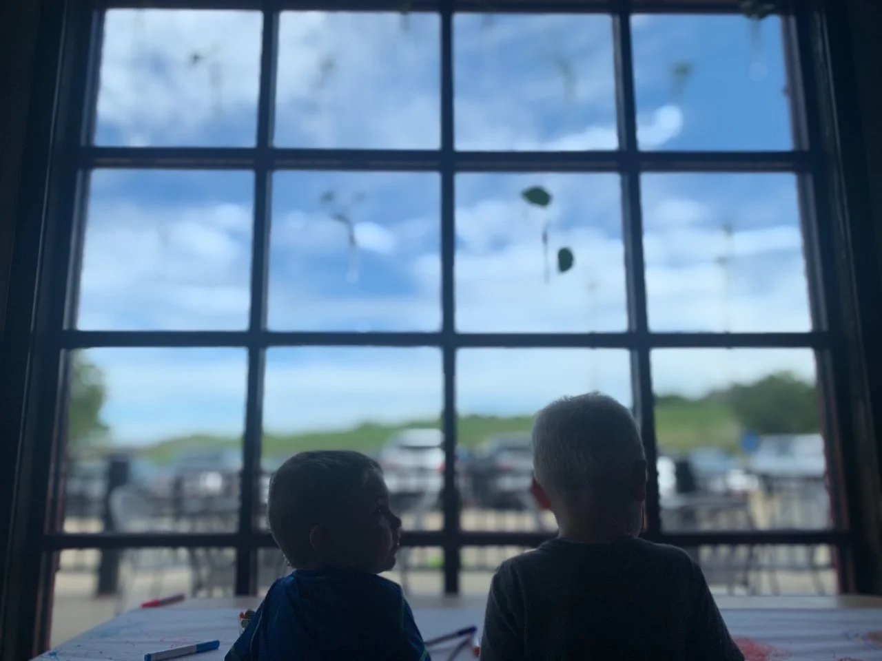 Two brothers enjoy snacks at a coloring table at the MHK Play Studio opening event.