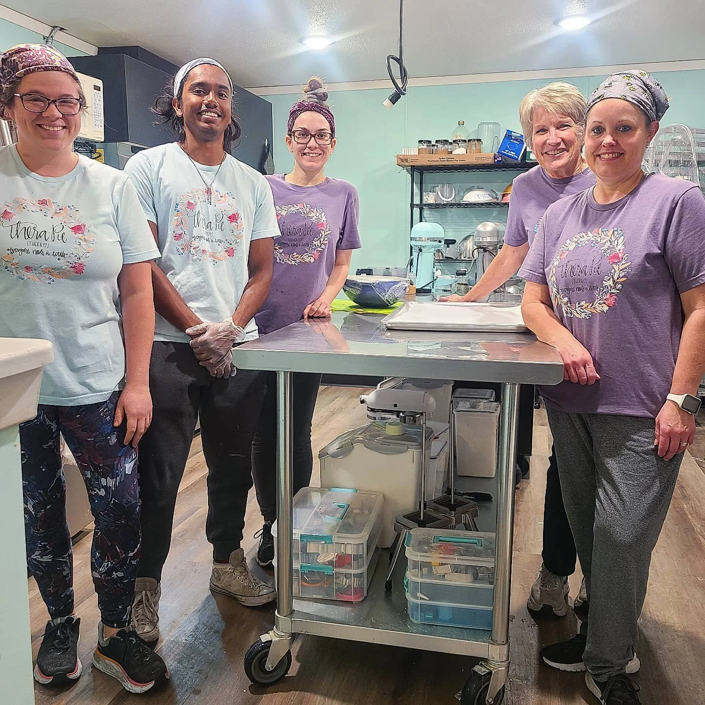 Tiffany and team members gathered in their kitchen.